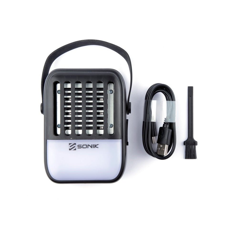 Produs de marca multifunctional Sonik care are funcţia de lampă și exterminator de insecte, perfect pentru pescuit sau pentru sesiunile de camping.