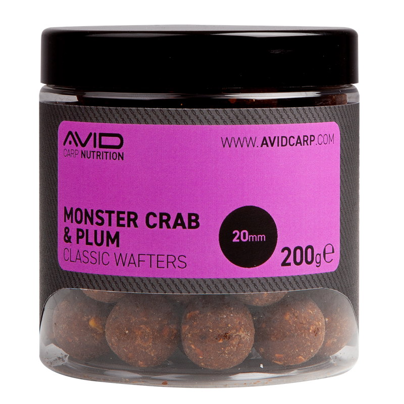 Wafters a mărcii Avid Carp, gamă Classic, aromă Monster Crab & Prună, în special pentru carpfishing.
