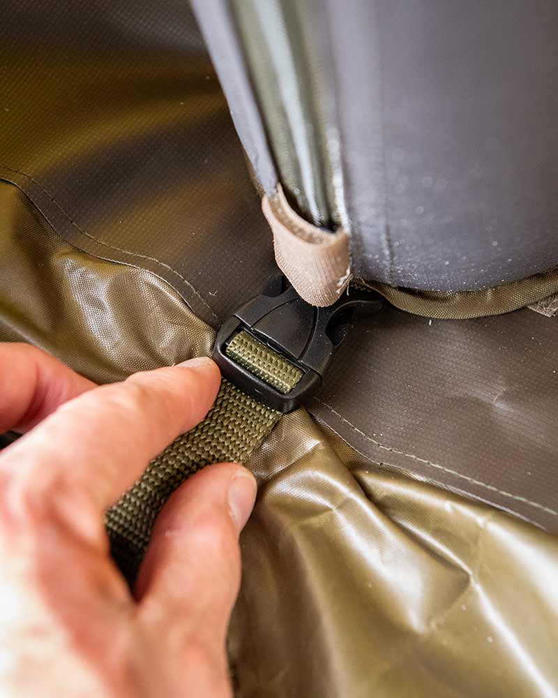 - Panoul din spate cu fermoar permite intrarea din spate sau extinderea bivuacului/umbrelei.