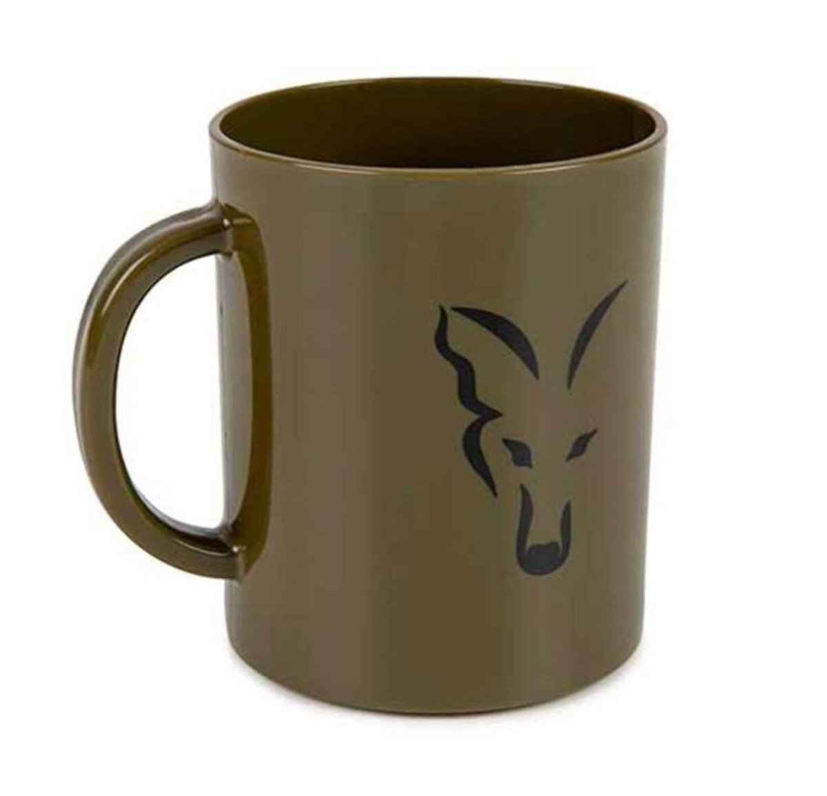 Cană de marcă Fox cu design color verde și logo în culoare negru, special pentru carpfishing.