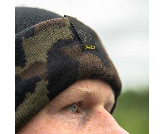 Beanie de marcă Avid Carp, la Culoare negru și camuflaj, în special pentru carpfishing.