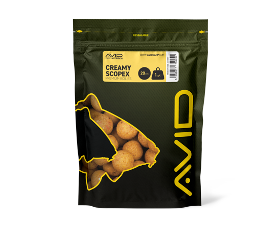 Boilies de marcă Avid Carp, aromă cremoasă Scopexo momeală dulce pe bază de proteine din lapte, concepută pentru a oferi performanțe excepționale pe tot parcursul anului, deosebit de eficientă în apă rece, în special pentru carpfishing.