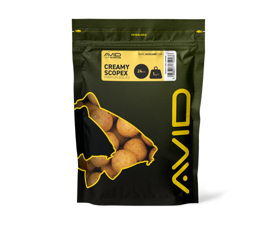 Boilies de marcă Avid Carp, aromă cremoasă Scopexo momeală dulce pe bază de proteine din lapte, concepută pentru a oferi performanțe excepționale pe tot parcursul anului, deosebit de eficientă în apă rece, în special pentru carpfishing.