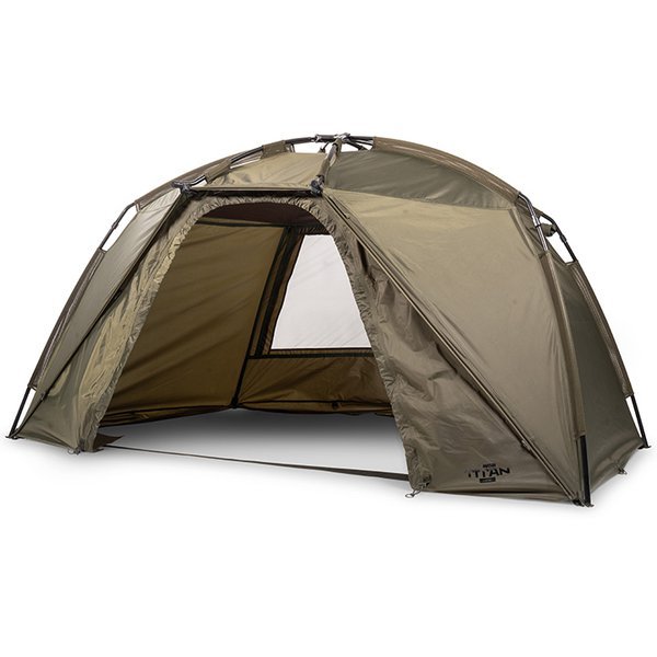 Bivvy a mărcii Nash model Titan Hide în versiunea sa versiunea standard cu design în Culoare verdespecial pentru carpfishing.
