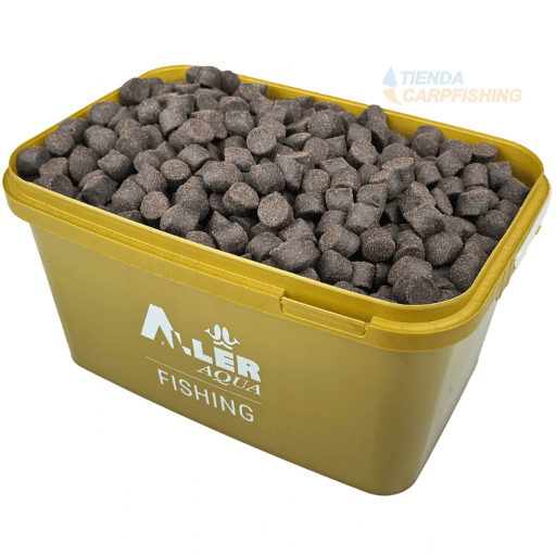 Cubul de pelete al mărcii Aller Aqua, aromă Halibutul negru, Perfect pentru sesiunile tale de pescuit.