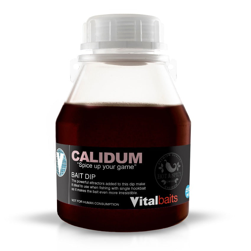 Canistră de dip de marcă Vitalbaits, aromă Calidum, speciale pentru a vă îmbunătăți momelile pentru carpfishing.