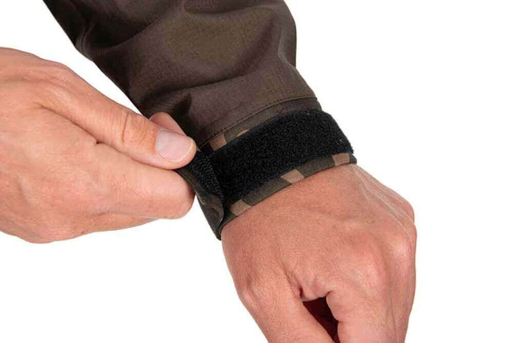Jachetă impermeabilă cu glugă de marcă Fox model RS 10 K cu design camuflaj în culoare kakispecial pentru carpfishing.