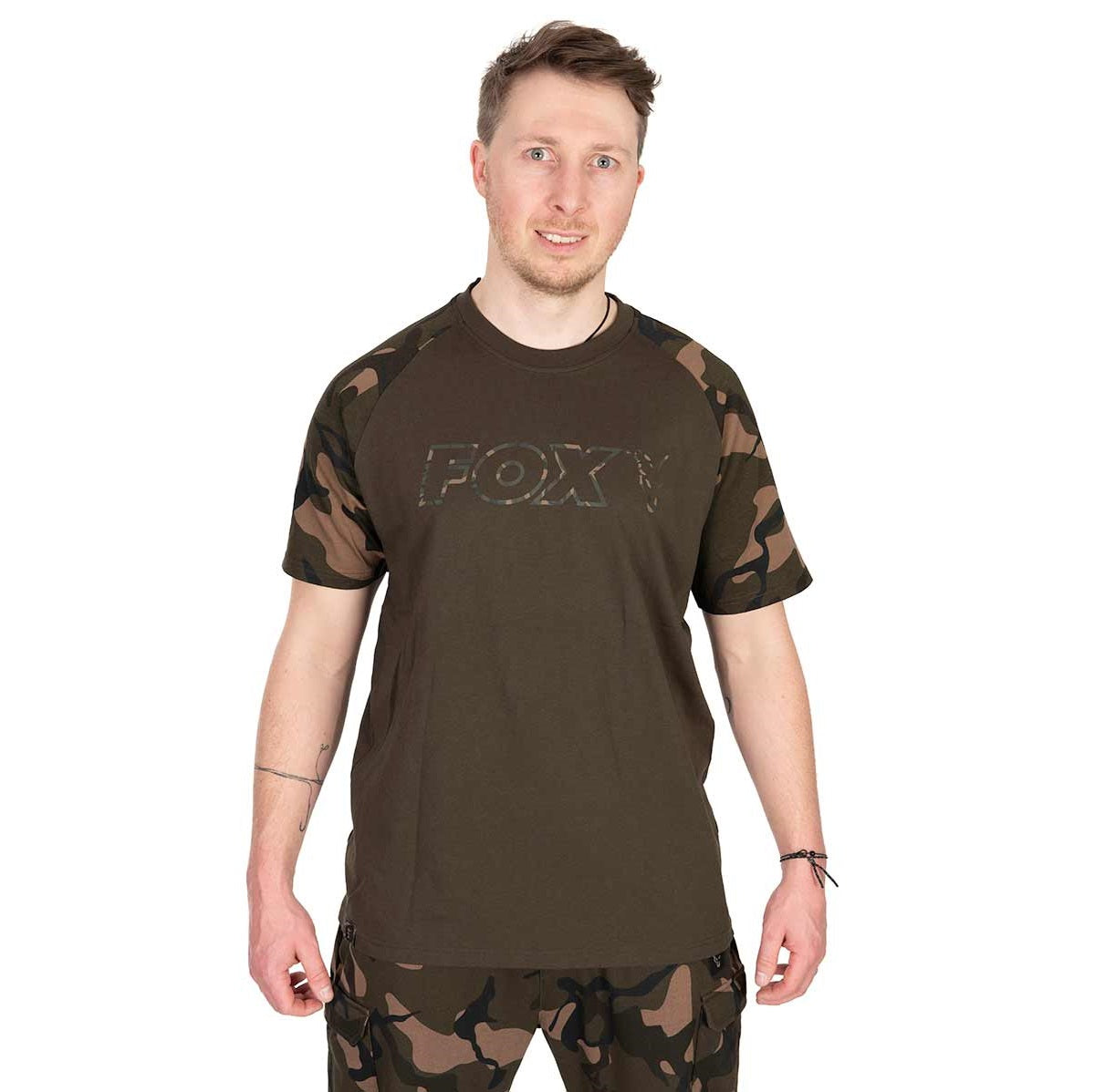Tricou de marcă Fox model Outline T în culoare kaki/camo, în special pentru carpfishing.