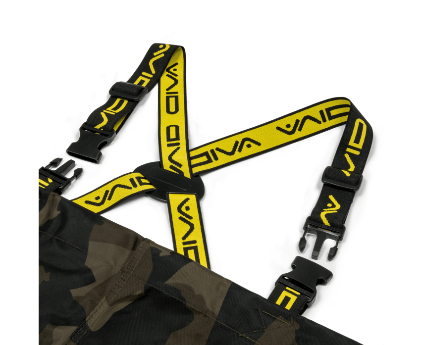 Waders de marca Avid Carp model Distortion} Active-Line cu design camuflaj închis, special pentru carpfishing.