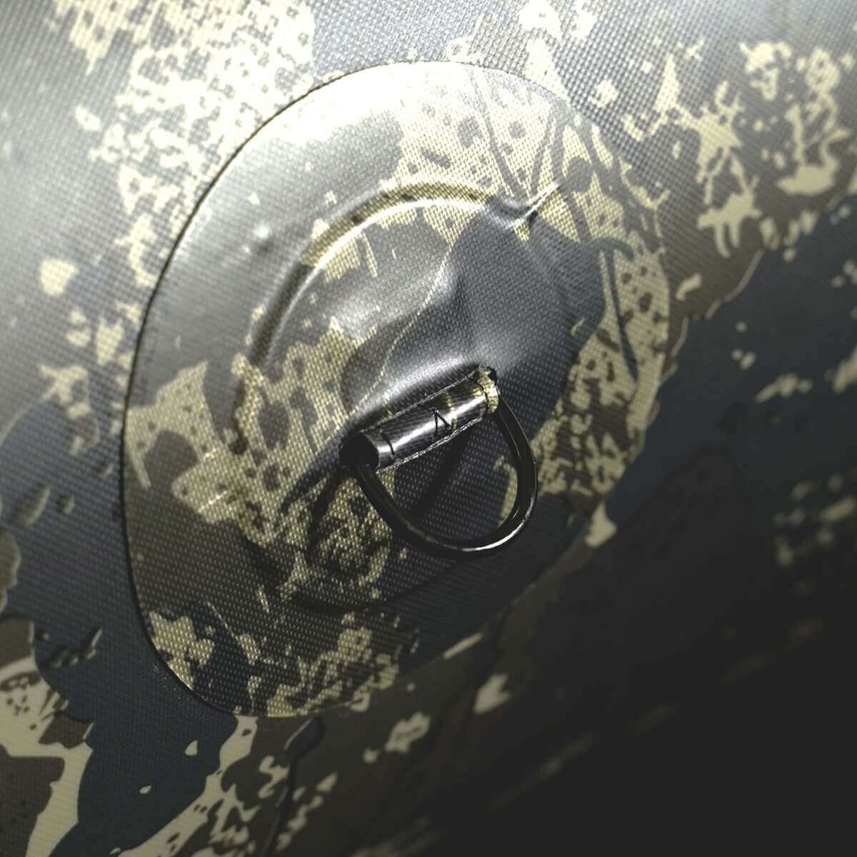 Barca compactă a mărcii Raptor model 230 X-Wide în culoarea camuflajului verde și negruspecial pentru carpfishing.