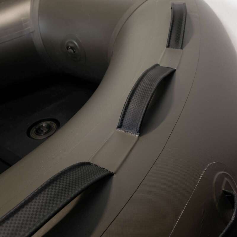 Barca compactă a mărcii Raptor model 270 X-Wide cu podea din aluminiu la Culoare verde, în special pentru carpfishing. Design potrivit pentru utilizarea în ape mai mici și sesiuni rapide.