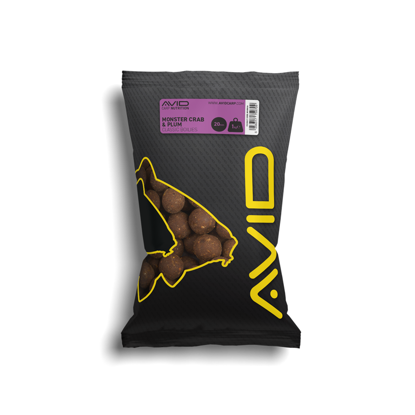 Boilies de marcă Avid Carp, gamă Classic, aromă Monster Crab & Prună, în special pentru carpfishing.